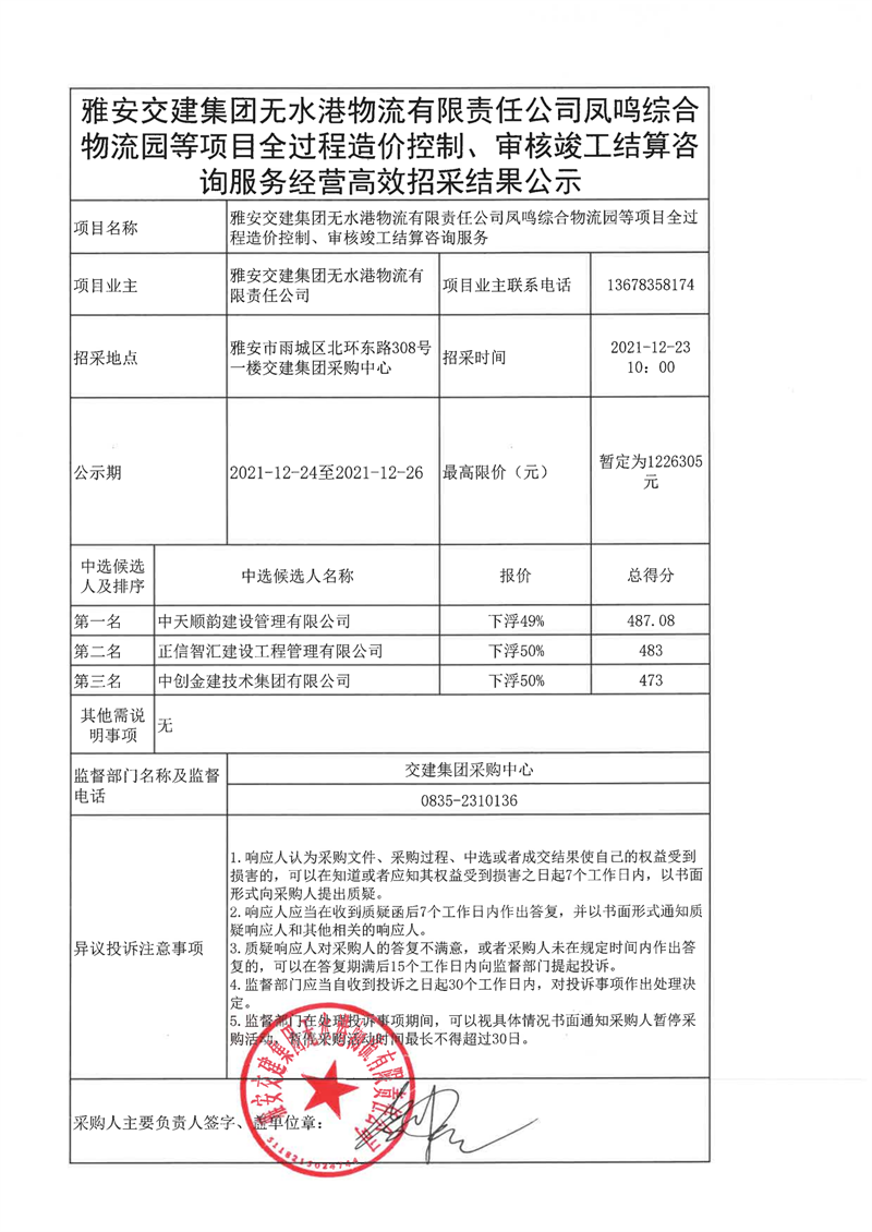 雅安交建集團(tuán)無(wú)水港物流有限責(zé)任公司鳳鳴綜合物流等項(xiàng)目全過(guò)程造價(jià)控制、審核竣工結(jié)算咨詢(xún)服務(wù)經(jīng)營(yíng)高效招采結(jié)果公示