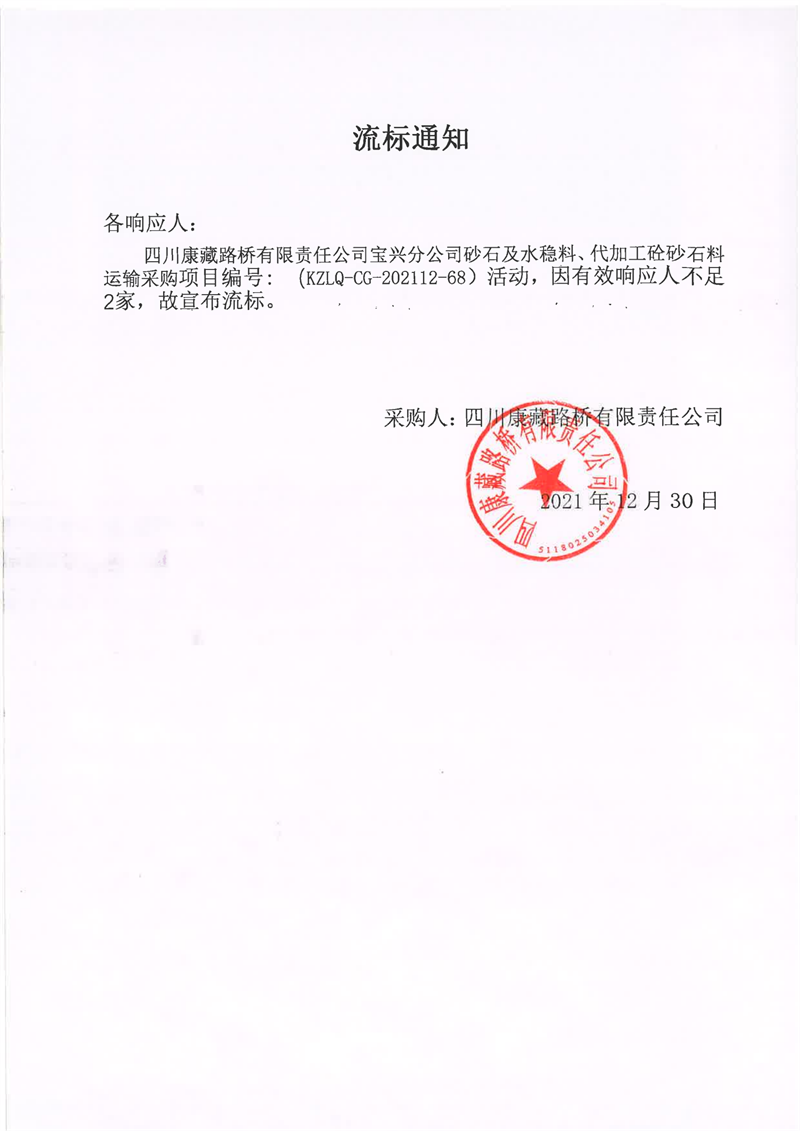 四川康藏路橋有限責(zé)任公司寶興分公司砂石及水穩(wěn)料、代加工砼砂石料運(yùn)輸采購(gòu)流標(biāo)通知