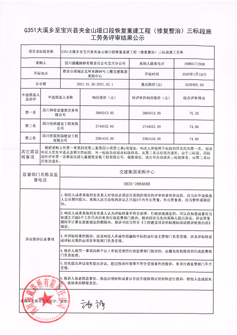 四川康藏路橋有限責(zé)任公司G351大溪鄉(xiāng)至寶興縣夾金山埡口段恢復(fù)重建工程(修復(fù)整治)三標(biāo)段施工勞務(wù)評審結(jié)果公示