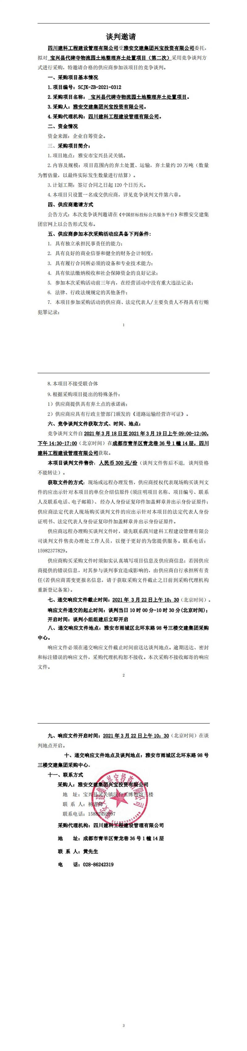 雅安交建集團(tuán)興寶投資有限公司寶興縣代碑寺物流園土地整理?xiàng)壨撂幹庙?xiàng)目(第二次)競(jìng)爭談判公告