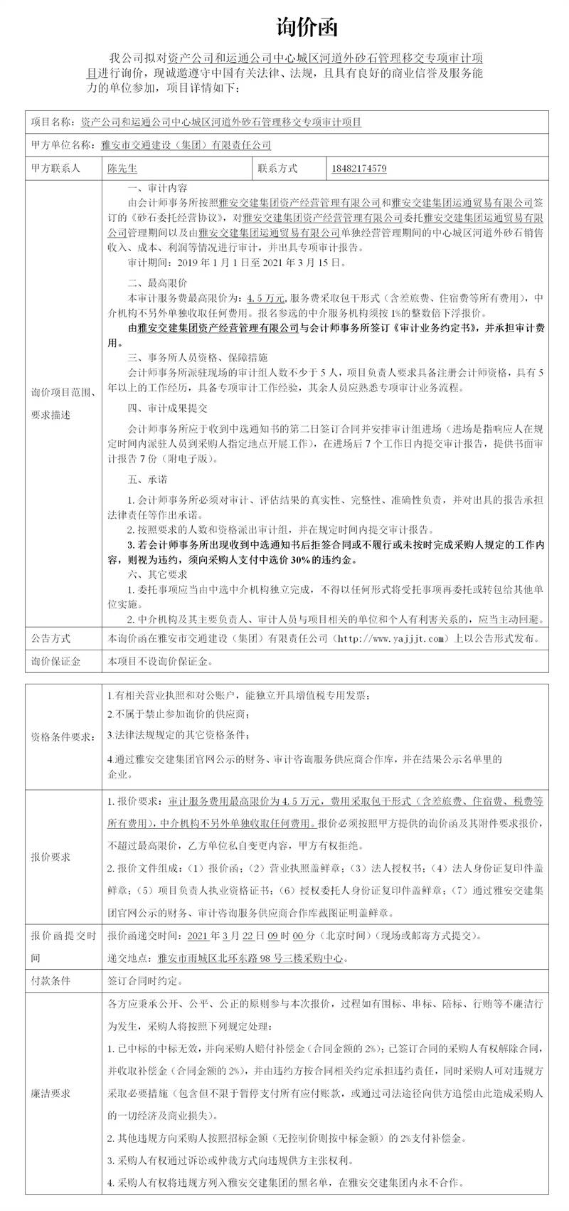 雅安市交通建設(集團)有限責任公司資產(chǎn)公司和運通公司中心城區(qū)河道外砂石管理移交專項審計項目詢價函