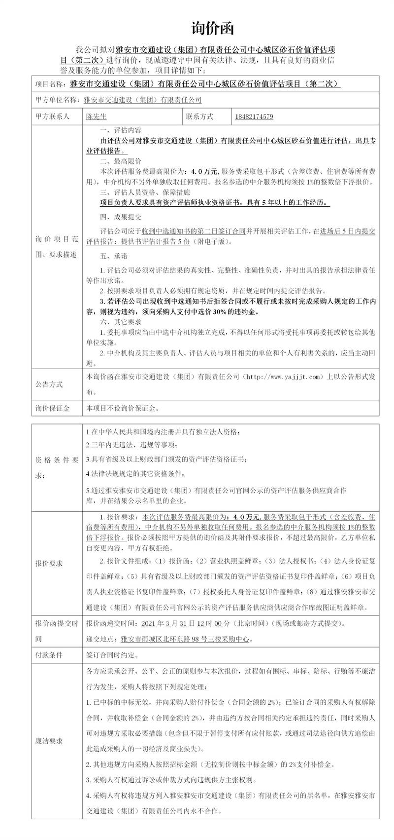 雅安市交通建設(shè)(集團(tuán))有限責(zé)任公司中心城區(qū)砂石價(jià)值評(píng)估項(xiàng)目(第二次)詢價(jià)函