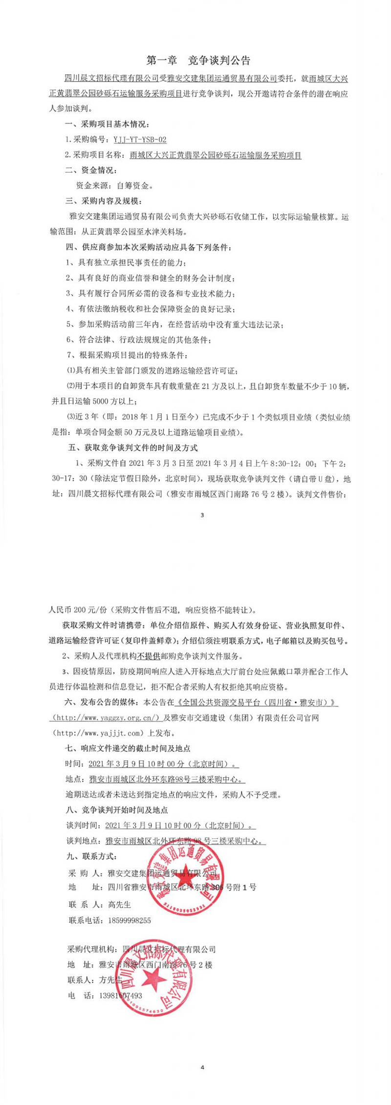 雅安交建集團(tuán)運(yùn)通貿(mào)易有限公司雨城區(qū)大興正黃翡翠公園砂礫石運(yùn)輸服務(wù)采購項(xiàng)目競爭談判公告