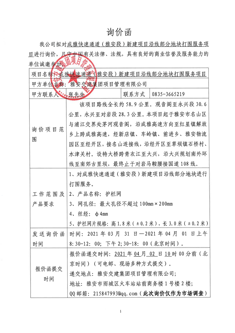 雅安交建集團項目管理有限公司成雅快速通道(雅安段)新建項目沿線部分地塊打圍服務項目詢價函