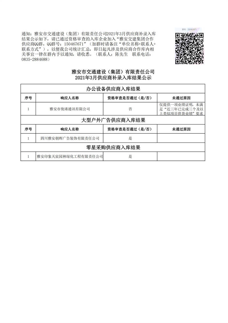 雅安市交通建設(集團)有限責任公司2021年3月供應商補錄入庫結(jié)果公示