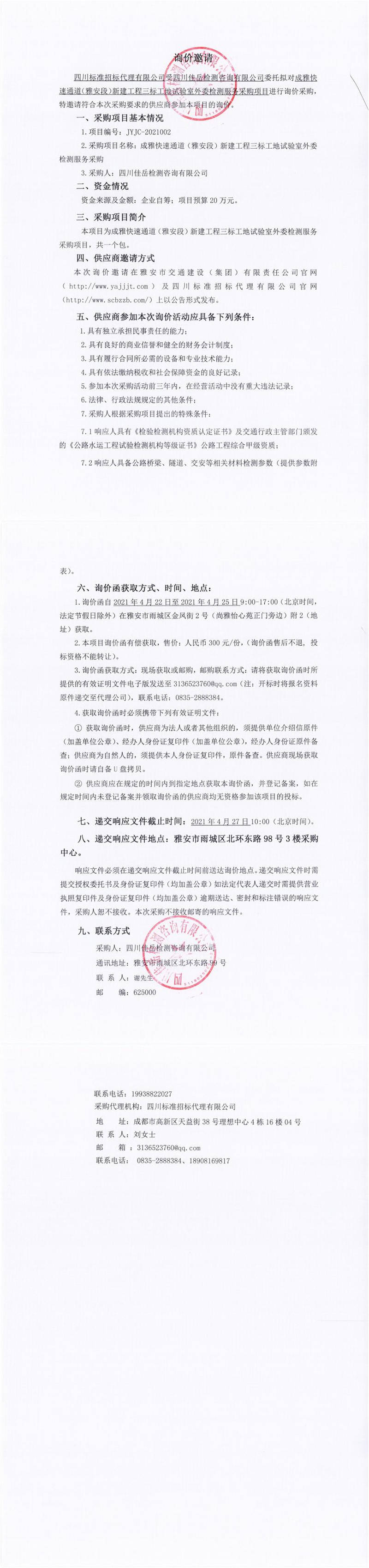 四川佳岳檢測咨詢有限公司成雅快速通道(雅安段)新建工程三標工地試驗室外委檢測服務(wù)采購詢價公告