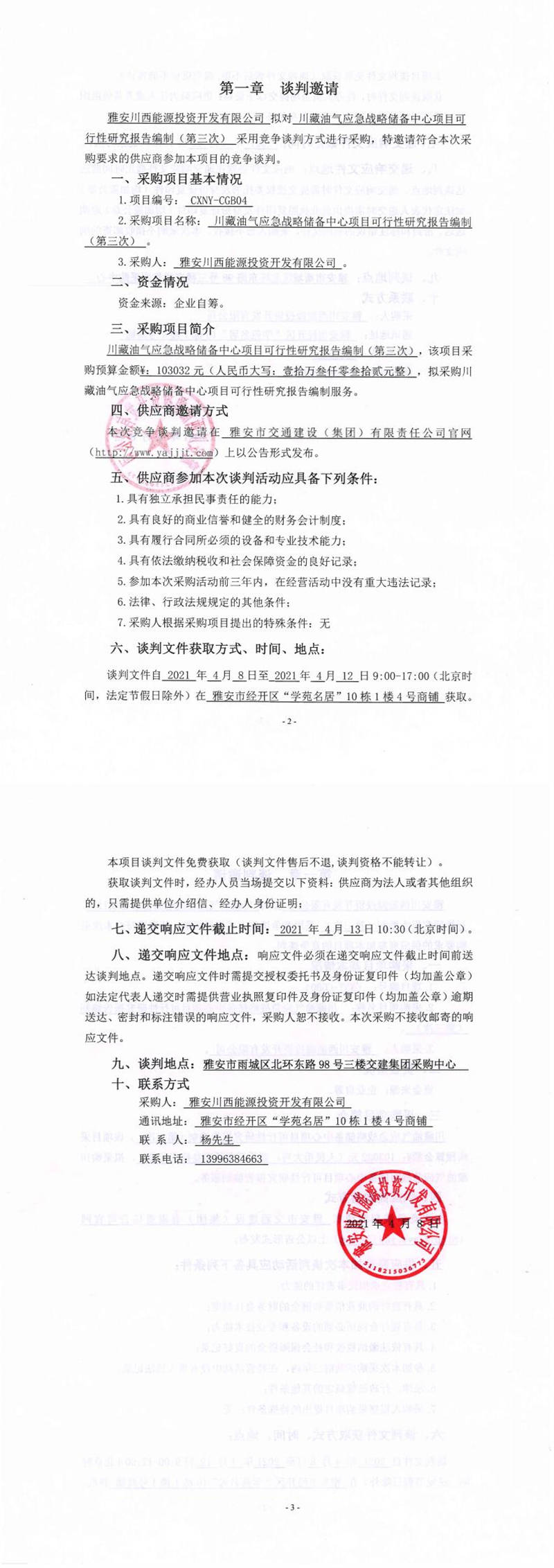 雅安川西能源投資開發(fā)有限公司川藏油氣應(yīng)急戰(zhàn)略儲備中心項目可行性研究報告編制(第三次)競爭談判公告