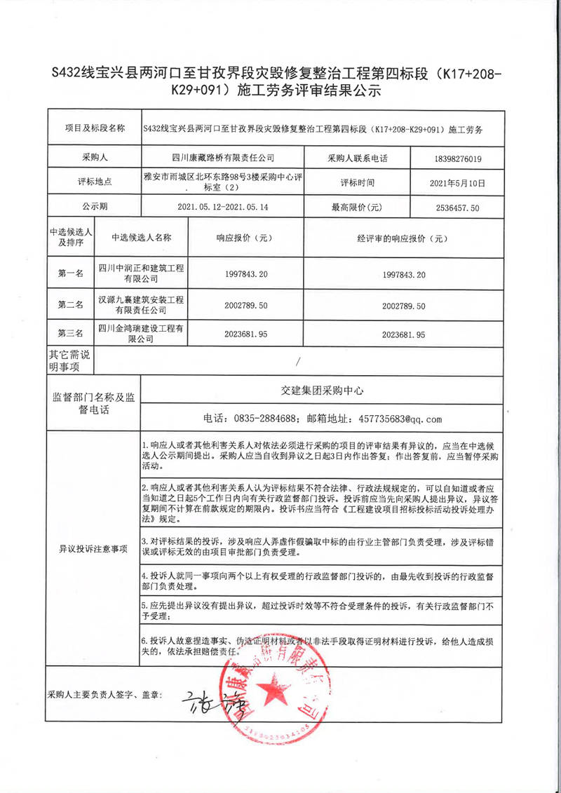 四川康藏路橋有限責(zé)任公司S432線寶興縣兩河口至甘孜界段災(zāi)毀修復(fù)整治工程第四標(biāo)段(K17+208-K29+091)施工勞務(wù)評審結(jié)果公示