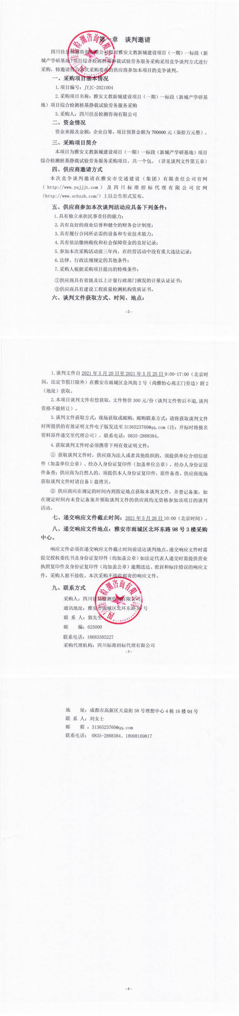 四川佳岳檢測咨詢有限公司雅安文教新城建設(shè)項目(一期)一標段(新城產(chǎn)學研基地)項目綜合檢測樁基靜載試驗勞務(wù)服務(wù)競爭談判公告