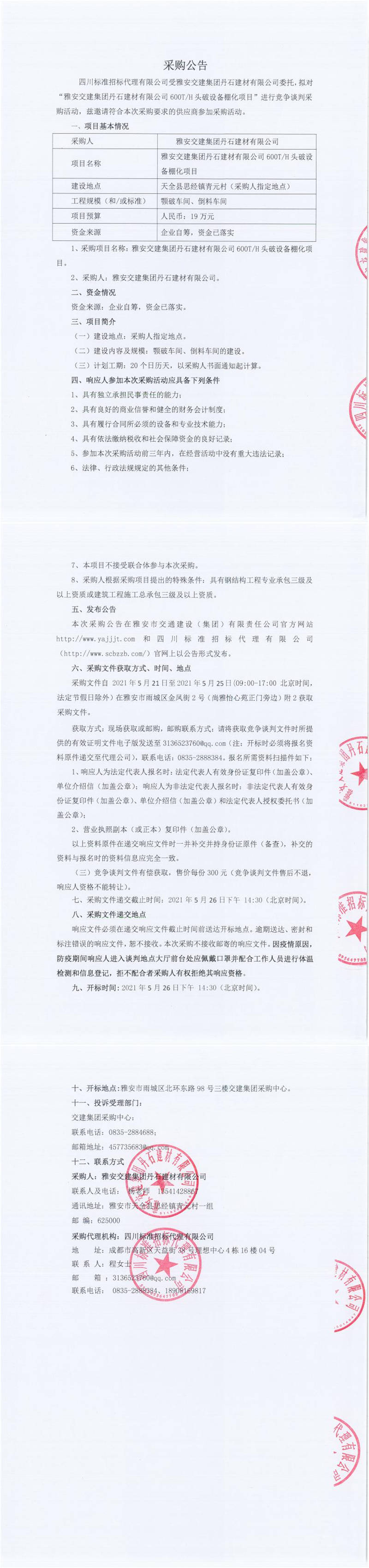 雅安交建集團(tuán)丹石建材有限公司600T/H頭破設(shè)備棚化項(xiàng)目競爭談判公告
