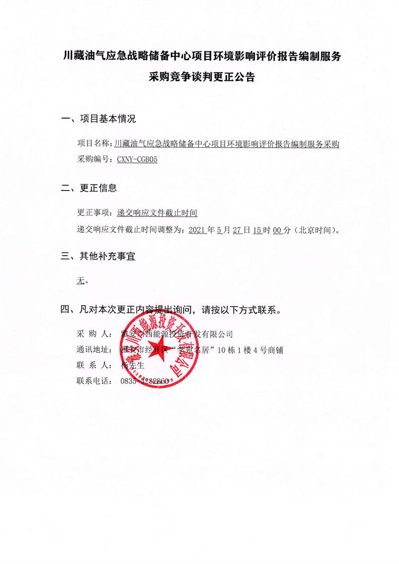 雅安川西能源投資開發(fā)有限公司川藏油氣應(yīng)急戰(zhàn)略儲備中心項目環(huán)境影響評價報告編制服務(wù)采購競爭談判更正公告