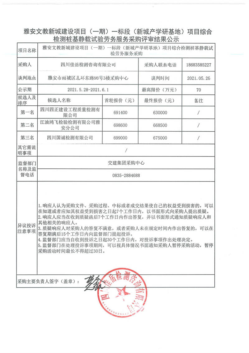 四川佳岳檢測咨詢有限公司雅安文教新城建設(shè)項(xiàng)目(一期)一標(biāo)段(新城產(chǎn)學(xué)研基地)項(xiàng)目綜合檢測樁基靜載試驗(yàn)勞務(wù)服務(wù)采購評(píng)審結(jié)果公示