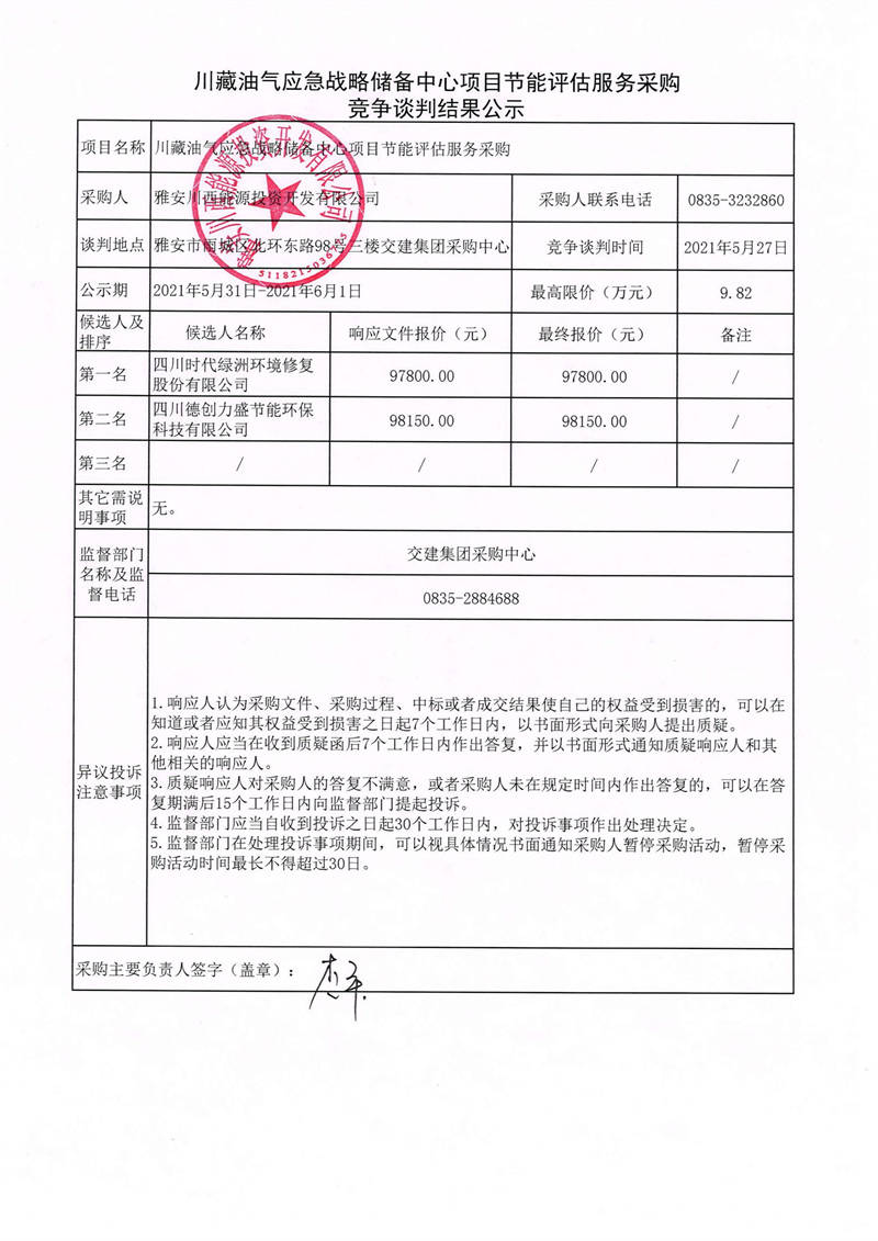 雅安川西能源投資開發(fā)有限公司川藏油氣應(yīng)急戰(zhàn)略儲備中心項目節(jié)能評估服務(wù)采購競爭談判結(jié)果公示