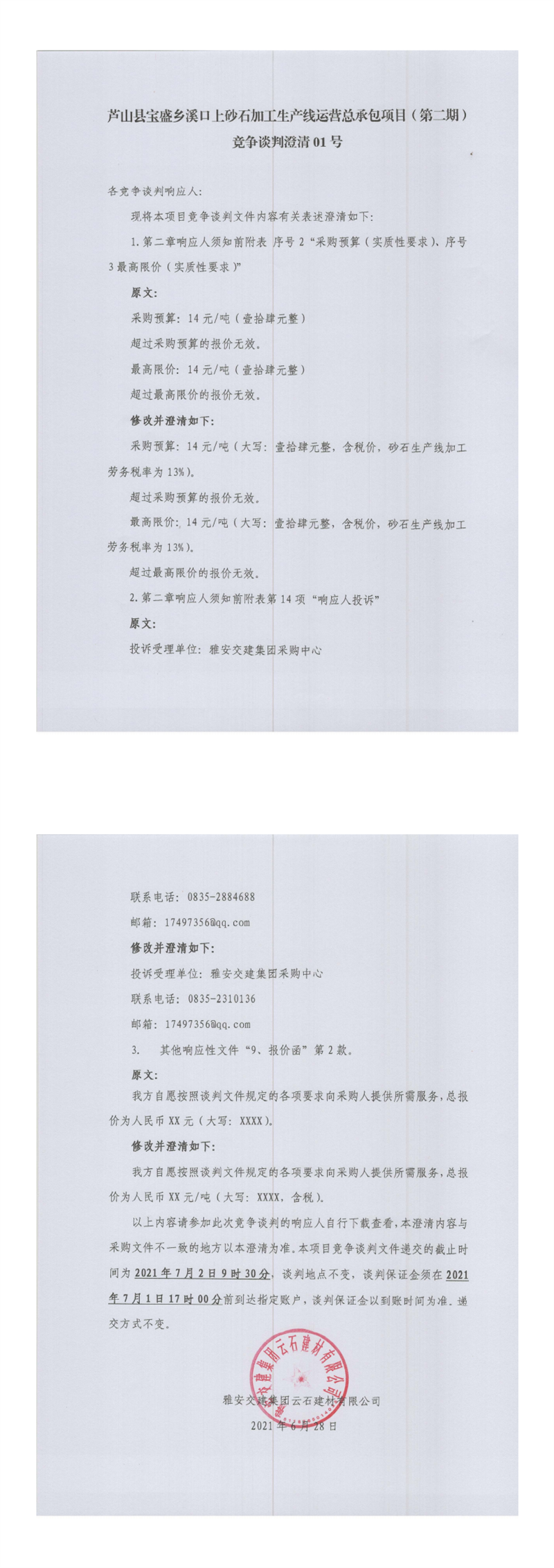 雅安交建集團(tuán)云石建材有限公司蘆山縣寶盛鄉(xiāng)溪口上砂石加工生產(chǎn)線運營總承包項目(第二期)競爭談判澄清公告