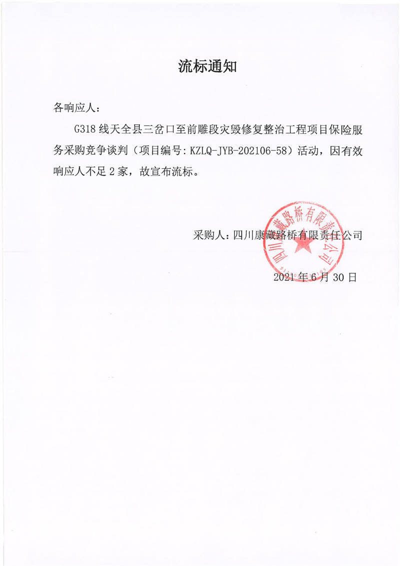 四川康藏路橋有限責(zé)任公司G318線天全縣三岔口至前雕段災(zāi)毀修復(fù)整治工程項(xiàng)目保險(xiǎn)服務(wù)采購流標(biāo)通知