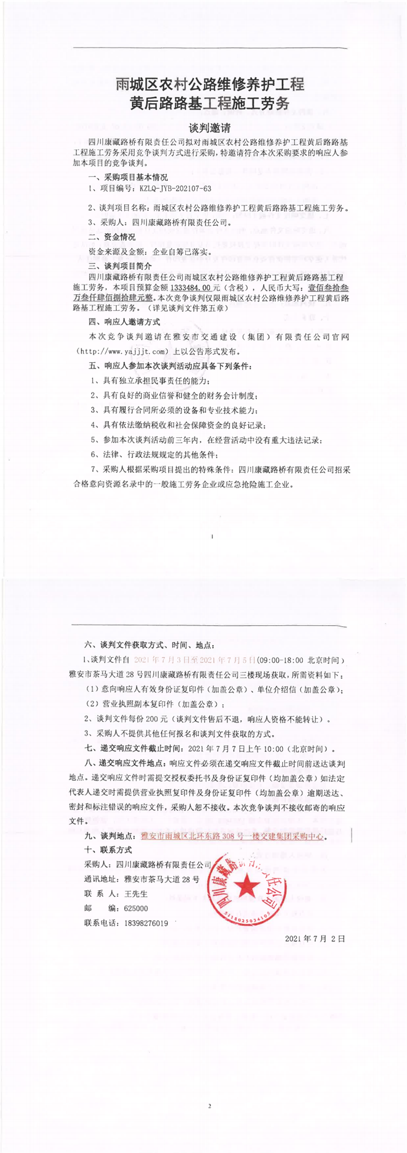 四川康藏路橋有限責(zé)任公司雨城區(qū)農(nóng)村維修養(yǎng)護(hù)工程黃后路路基工程施工勞務(wù)競(jìng)爭(zhēng)談判公告