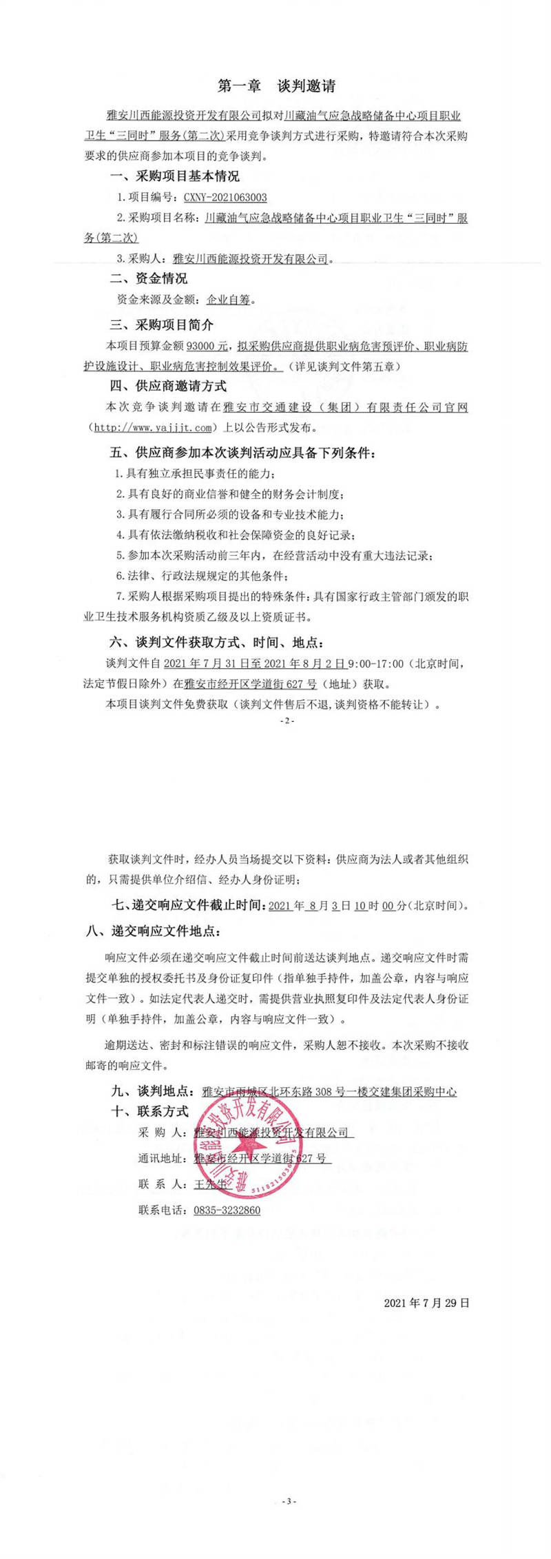 雅安川西能源投資開發(fā)有限公司川藏油氣應(yīng)急戰(zhàn)略儲備中心項(xiàng)目職業(yè)衛(wèi)生“三同時(shí)”服務(wù)(第二次)競爭談判公告