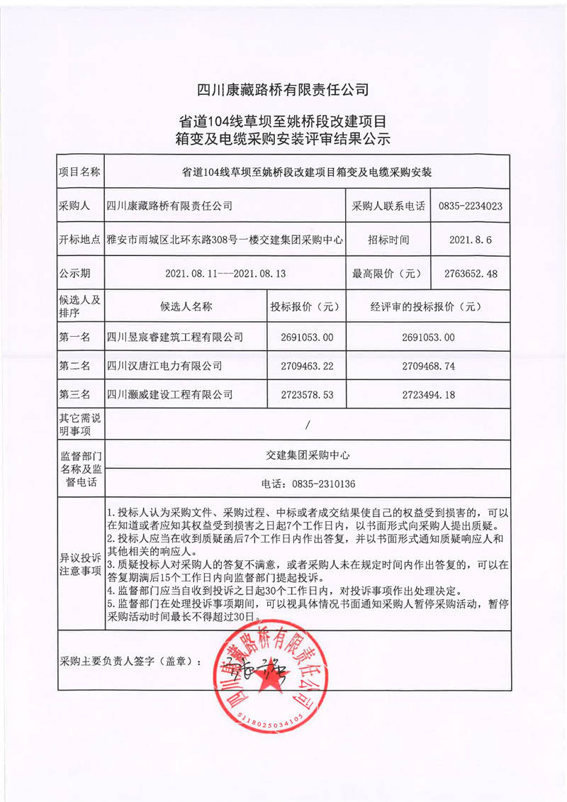 四川康藏路橋有限責(zé)任公司省道104線草壩至姚橋段改建項(xiàng)目箱變及電纜采購(gòu)安裝評(píng)審結(jié)果公示