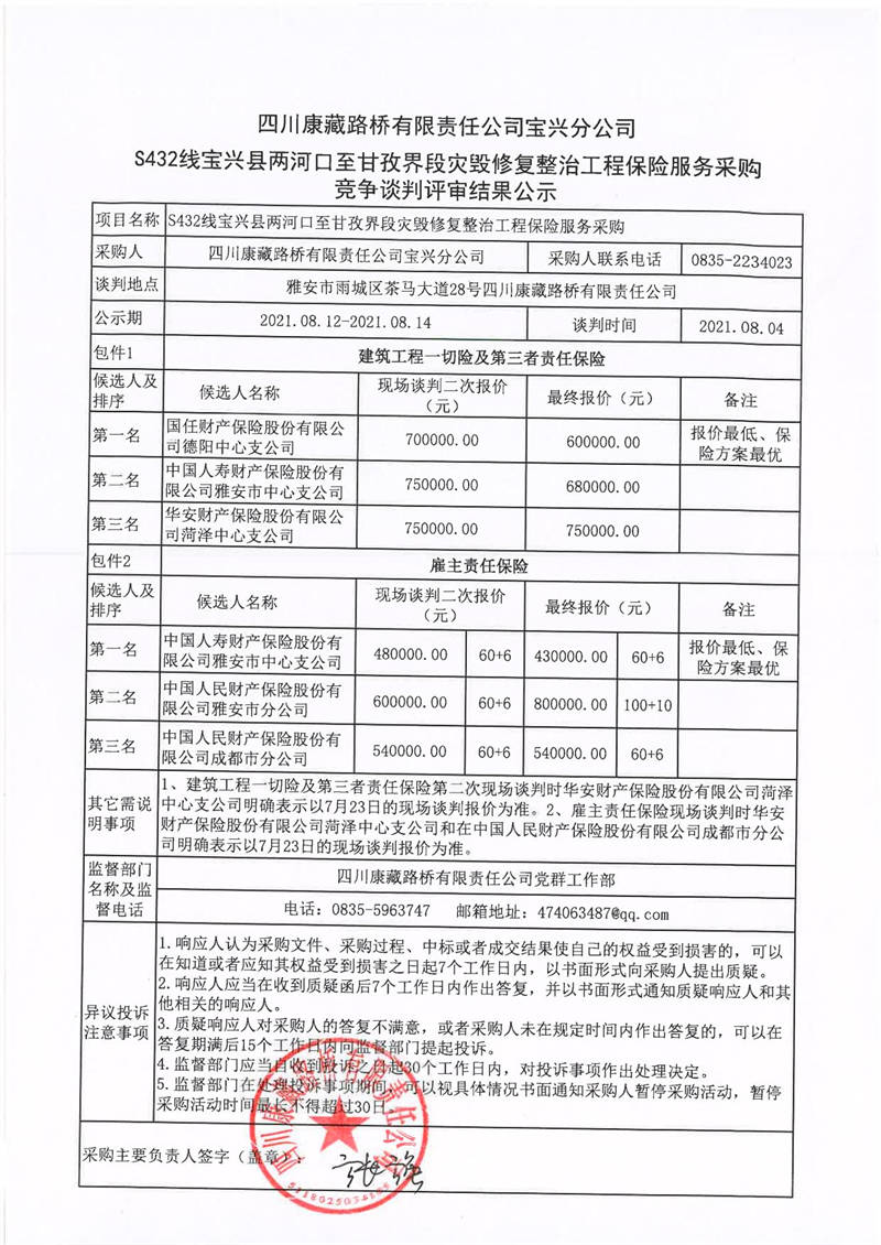 四川康藏路橋有限責(zé)任公司寶興分公司S432線寶興縣兩河口至甘孜界段災(zāi)毀修復(fù)整治工程保險(xiǎn)服務(wù)采購(gòu)競(jìng)爭(zhēng)談判評(píng)審結(jié)果公示