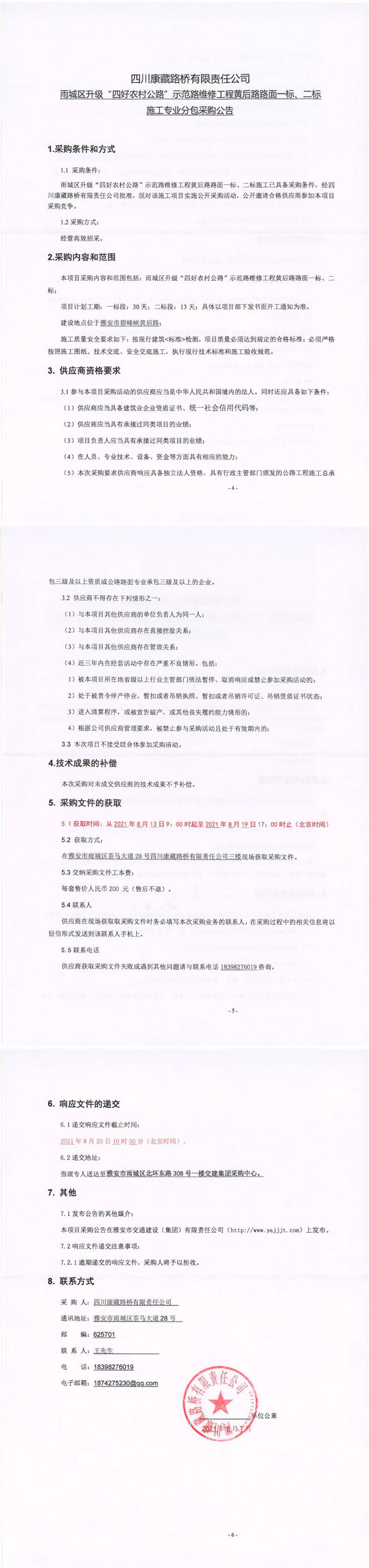 四川康藏路橋有限責(zé)任公司雨城區(qū)升級“四好農(nóng)材公路”示范路維修工程黃后路路面一標、二標施工專業(yè)分包采購公告
