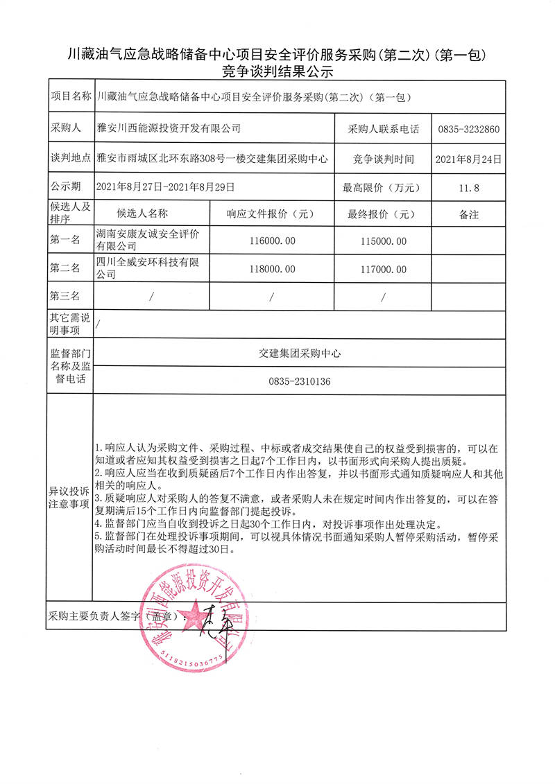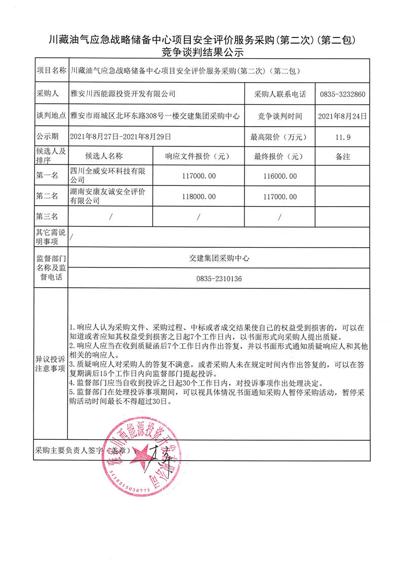 川藏油氣應急戰(zhàn)略儲備中心項目安全評價服務采購(第二次)(第一包、第二包)競爭談判結(jié)果公示