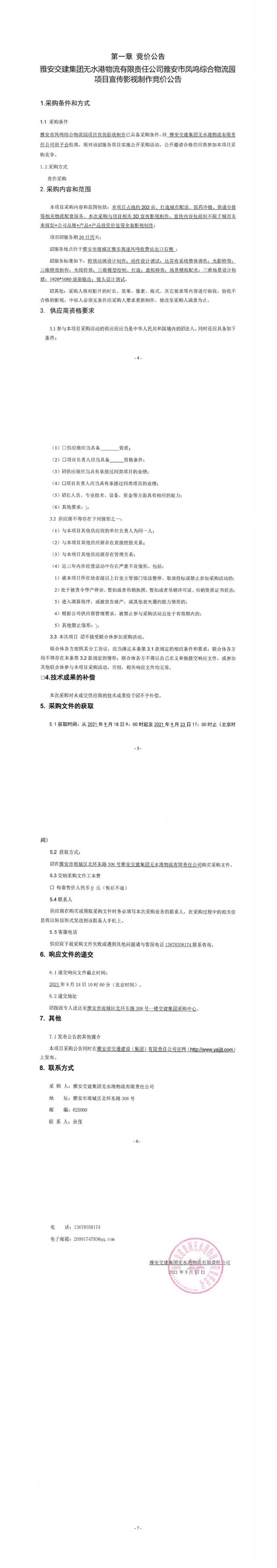雅安交建集團無水港物流有限責任公司雅安市鳳鳴綜合物流園項目宣傳影視制作競價公告
