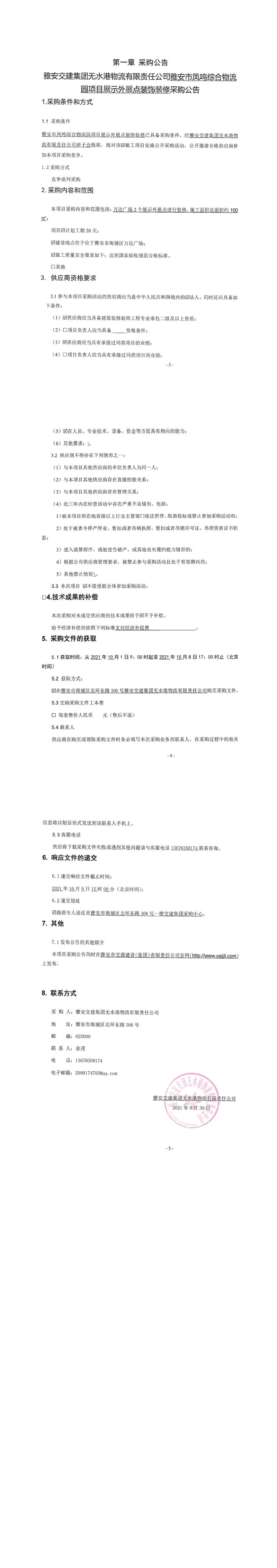 雅安交建集團(tuán)無(wú)水港物流有限責(zé)任公司雅安市鳳鳴綜合物流園項(xiàng)目展示外展點(diǎn)裝飾裝修采購(gòu)公告