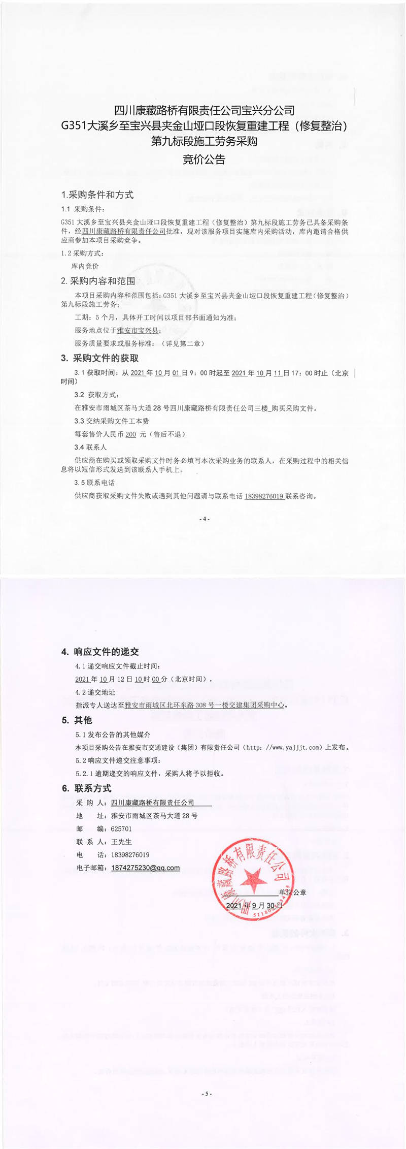 四川康藏路橋有限責(zé)任公司寶興分公司G351大溪鄉(xiāng)至寶興縣夾金山埡口段恢復(fù)重建工程(修復(fù)整治)第九標(biāo)段施工勞務(wù)采購(gòu)競(jìng)價(jià)公告