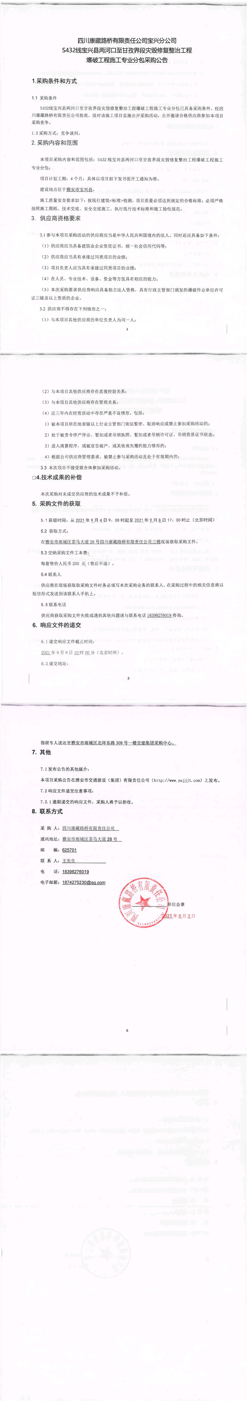 四川康藏路橋有限責(zé)任公司寶興分公司s432線寶興縣兩河口至甘孜界段災(zāi)毀修復(fù)整治工程爆破工程施工專業(yè)分包采購(gòu)公告