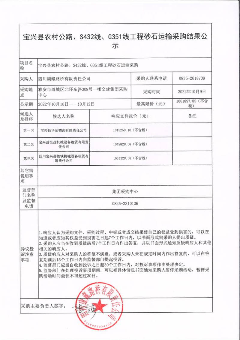 四川康藏路橋有限責(zé)任公司寶興縣農(nóng)村公路、S432線、G351線工程砂石運(yùn)輸采購(gòu)結(jié)果公示