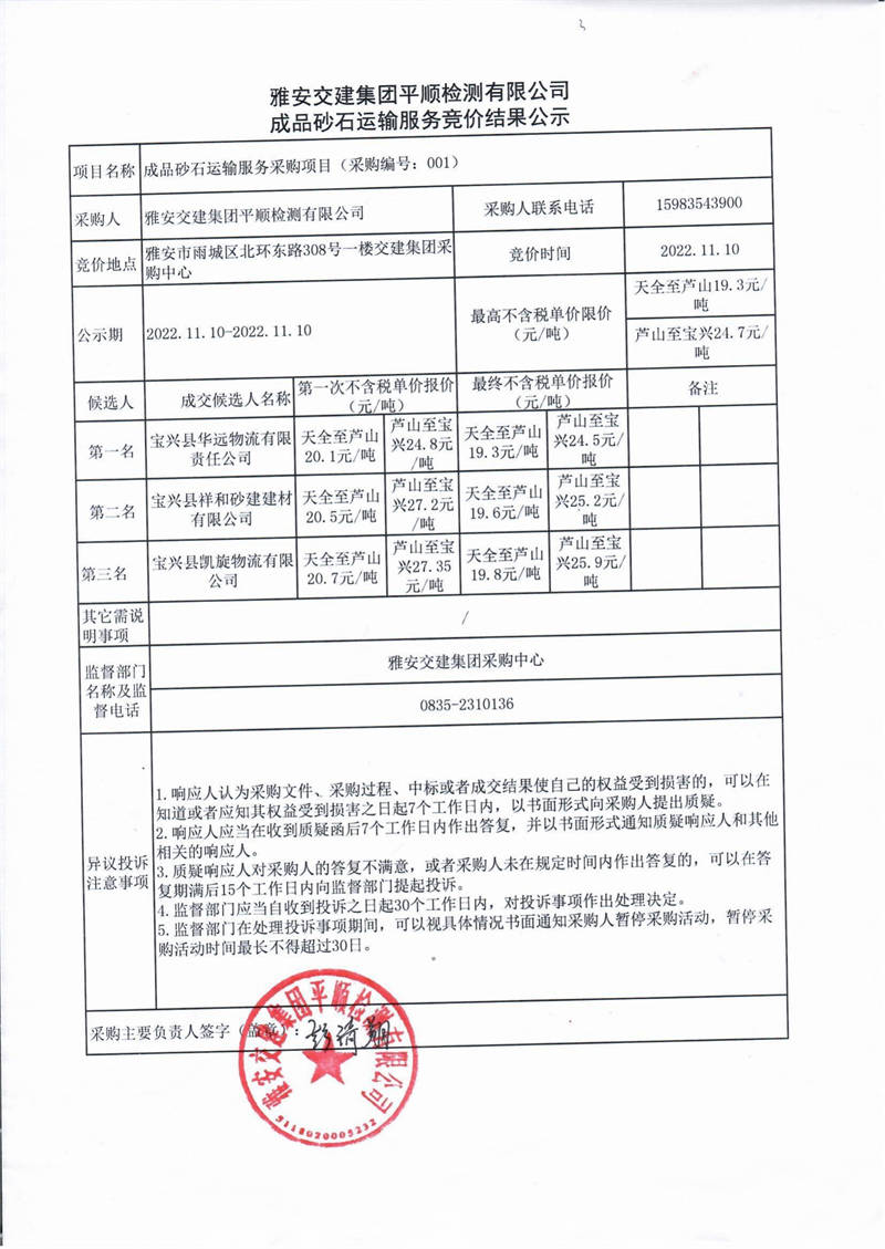 雅安交建集團(tuán)平順檢測有限公司成品砂石運(yùn)輸服務(wù)競價(jià)結(jié)果公示