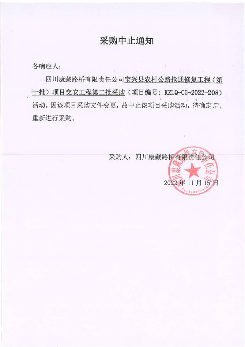 四川康藏路橋有限責(zé)任公司寶興縣農(nóng)村公路搶通修復(fù)工程(第一批)項(xiàng)目交安工程第二批采購(gòu)中止通知