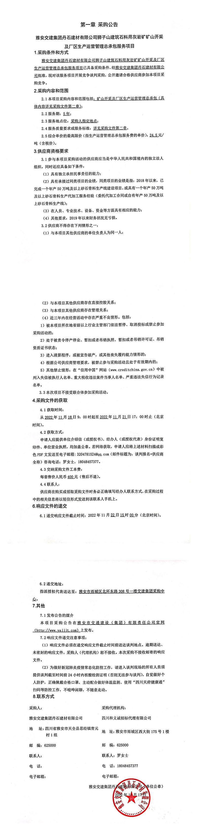 雅安交建集團(tuán)丹石建材有限公司獅子山建筑石料用灰?guī)r礦礦山開采及廠區(qū)生產(chǎn)運(yùn)營(yíng)管理總承包服務(wù)項(xiàng)目采購公告