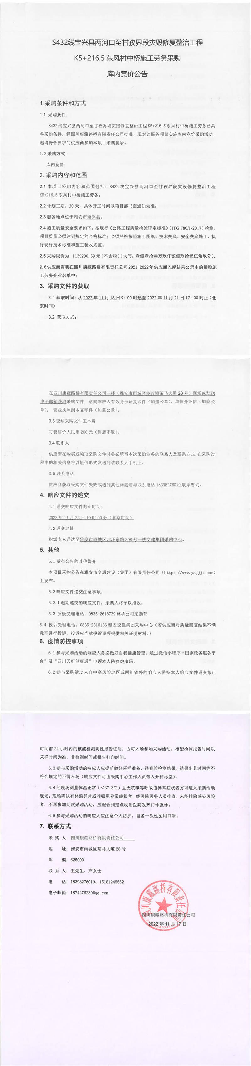 四川康藏路橋有限責(zé)任公司S432線寶興縣兩河口至甘孜界段災(zāi)毀修復(fù)整治工程K5+216.5東風(fēng)村中橋施工勞務(wù)采購庫內(nèi)競價(jià)公告