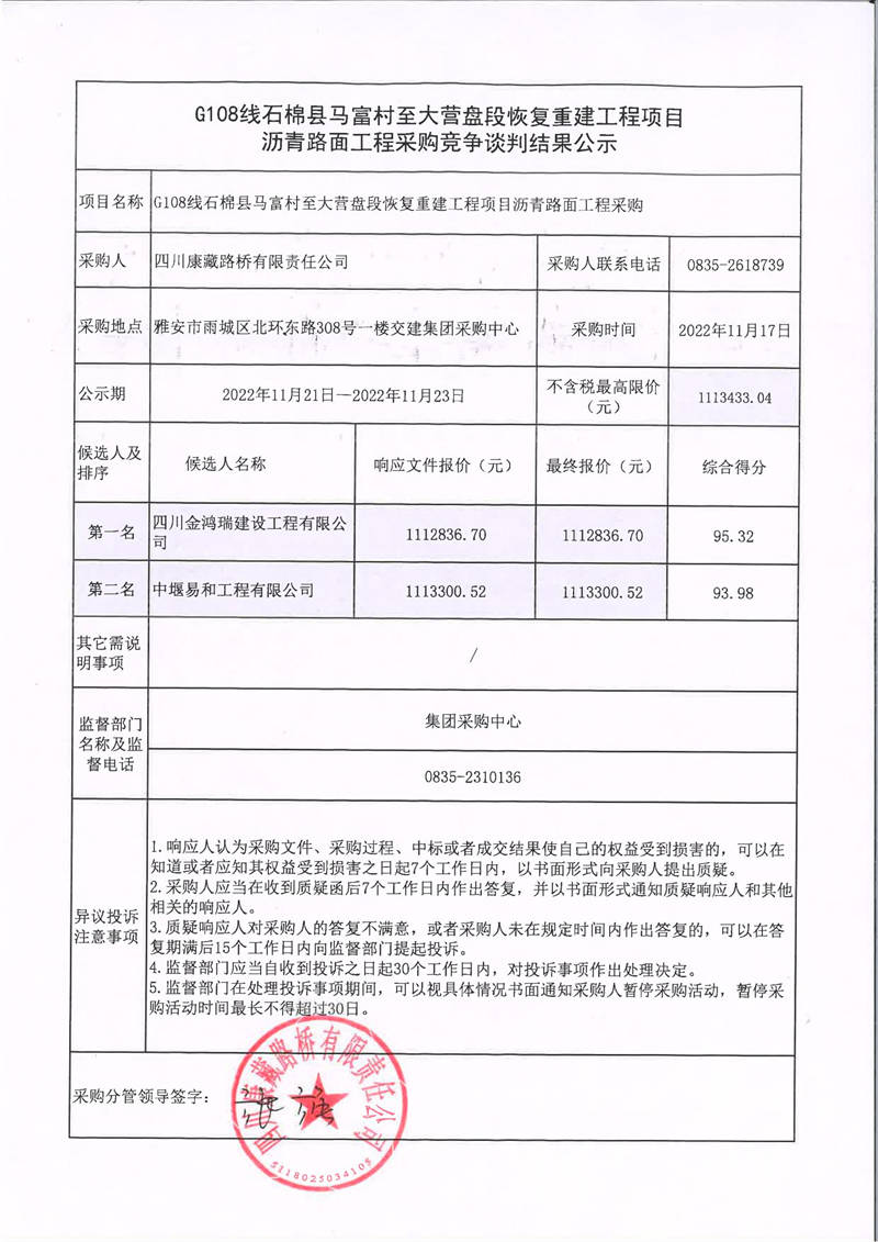 四川康藏路橋有限責(zé)任公司G108線(xiàn)石棉縣馬富村至大營(yíng)盤(pán)段恢復(fù)重建工程項(xiàng)目瀝青路面工程采購(gòu)競(jìng)爭(zhēng)談判結(jié)果公示