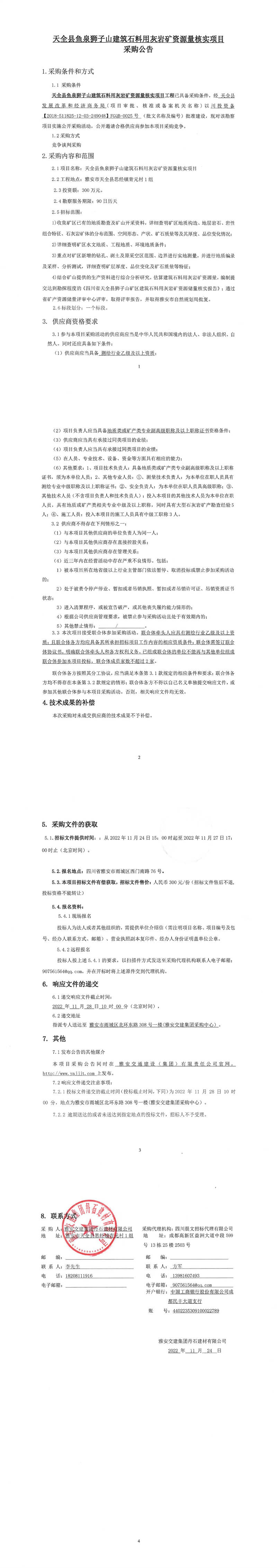 雅安交建集團(tuán)丹石建材有限公司天全縣魚(yú)泉獅子山建筑石料用灰?guī)r礦資源量核實(shí)項(xiàng)目采購(gòu)公告