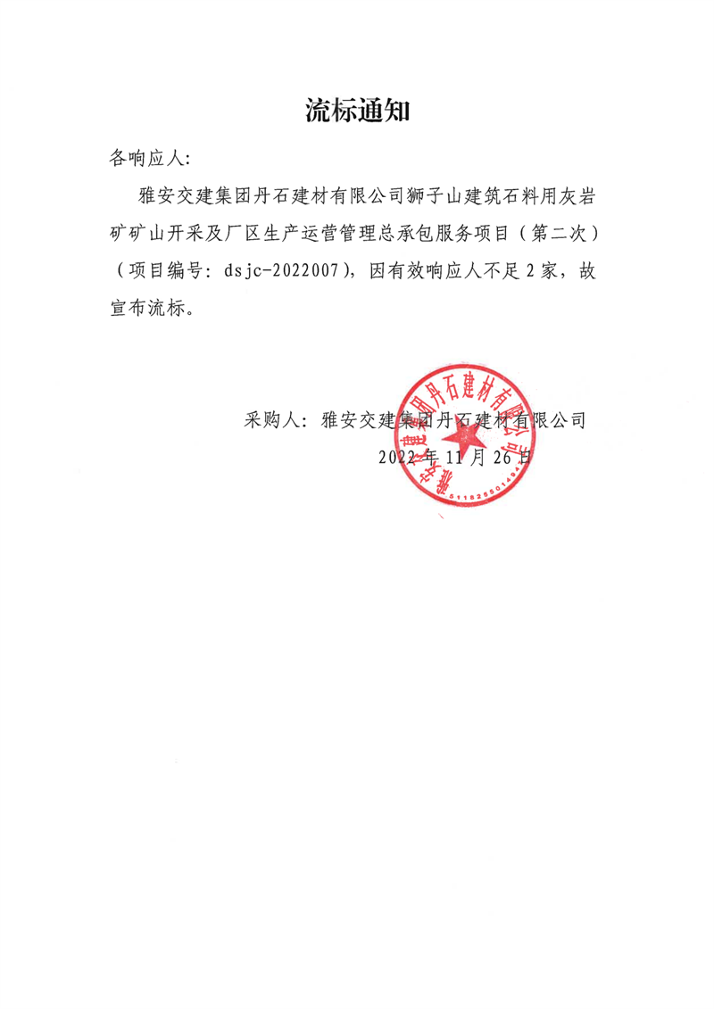雅安交建集團(tuán)丹石建材有限公司獅子山建筑石料用灰?guī)r礦礦山開(kāi)采及廠區(qū)生產(chǎn)運(yùn)營(yíng)管理總承包服務(wù)項(xiàng)目(第二次)流標(biāo)通知