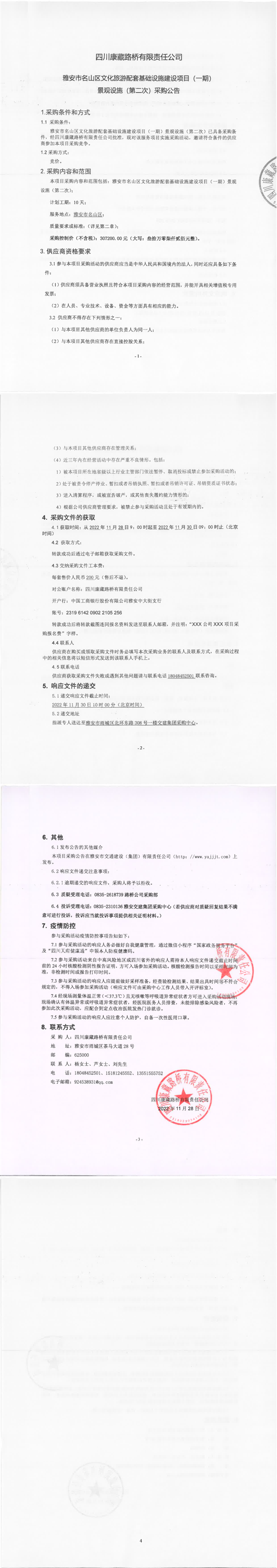 四川康藏路橋有限責(zé)任公司雅安市名山區(qū)文化旅游配套基礎(chǔ)設(shè)施建設(shè)項(xiàng)目(一期)景觀設(shè)施(第二次)采購公告