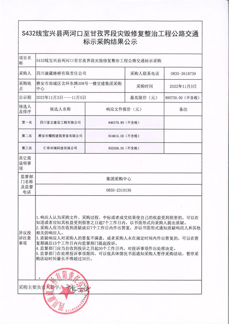 四川康藏路橋有限責任公司S432線寶興縣兩河口至甘孜界段災毀修復整治工程公路交通標示采購結果公示