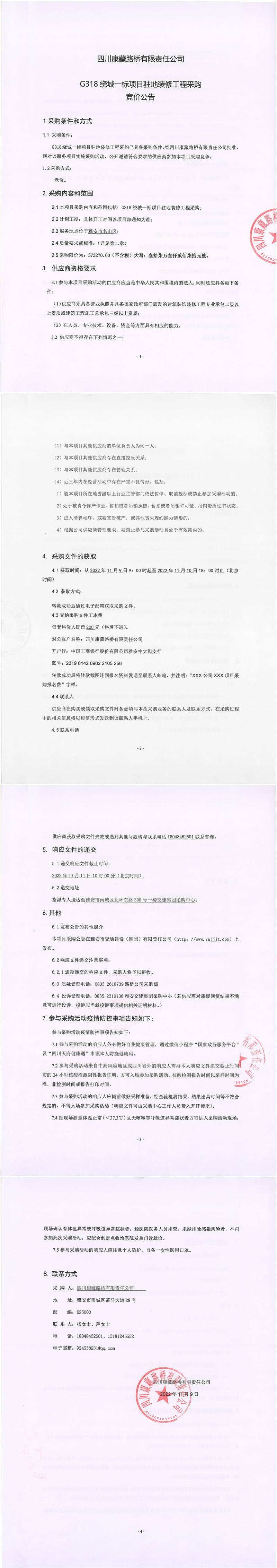 四川康藏路橋有限責(zé)任公司G318繞城一標(biāo)項目駐地裝修工程采購競價公告
