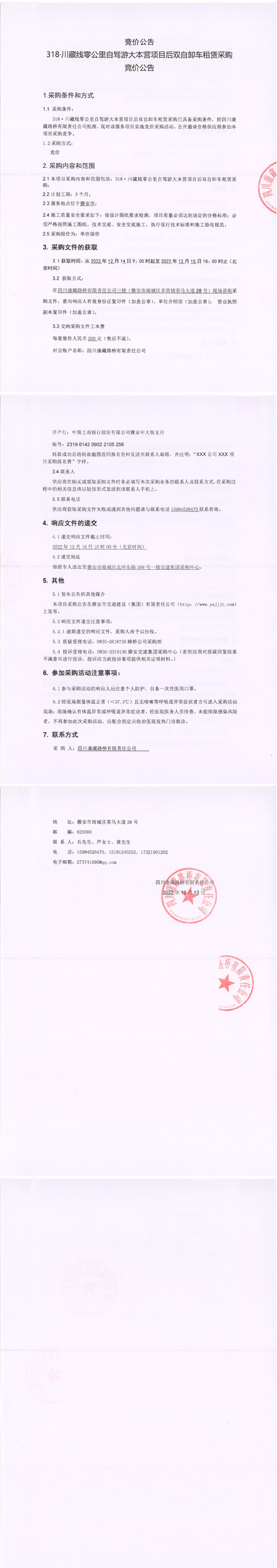 四川康藏路橋有限責(zé)任公司318.川藏線零公里自駕游大本營項(xiàng)目后雙自卸車租賃采購競價公告