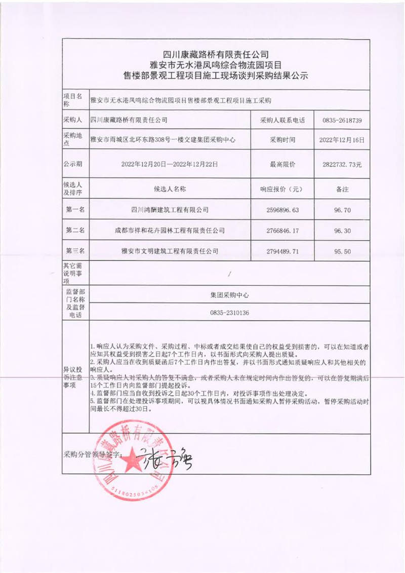 四川康藏路橋有限責(zé)任公司雅安市無(wú)水港鳳鳴綜合物流園項(xiàng)目售樓部景觀工程施工現(xiàn)場(chǎng)談判采購(gòu)結(jié)果公示