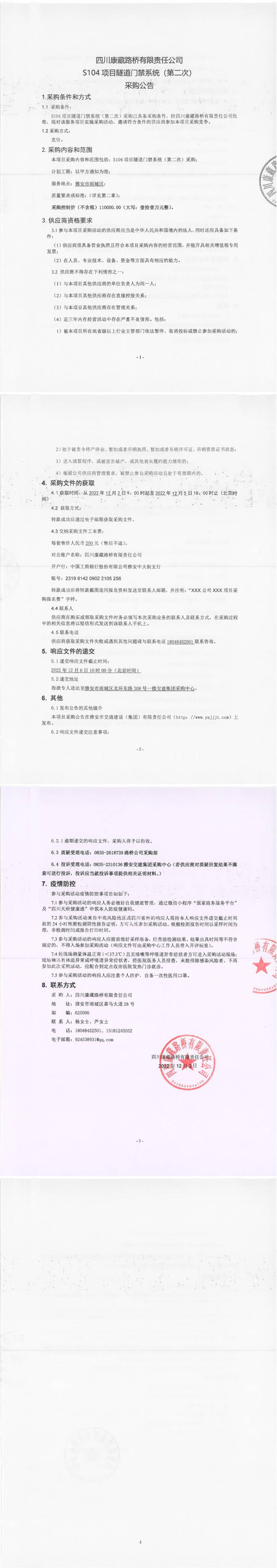 四川康藏路橋有限責(zé)任公司S104項(xiàng)目隧道門禁系統(tǒng)(第二次)采購公告