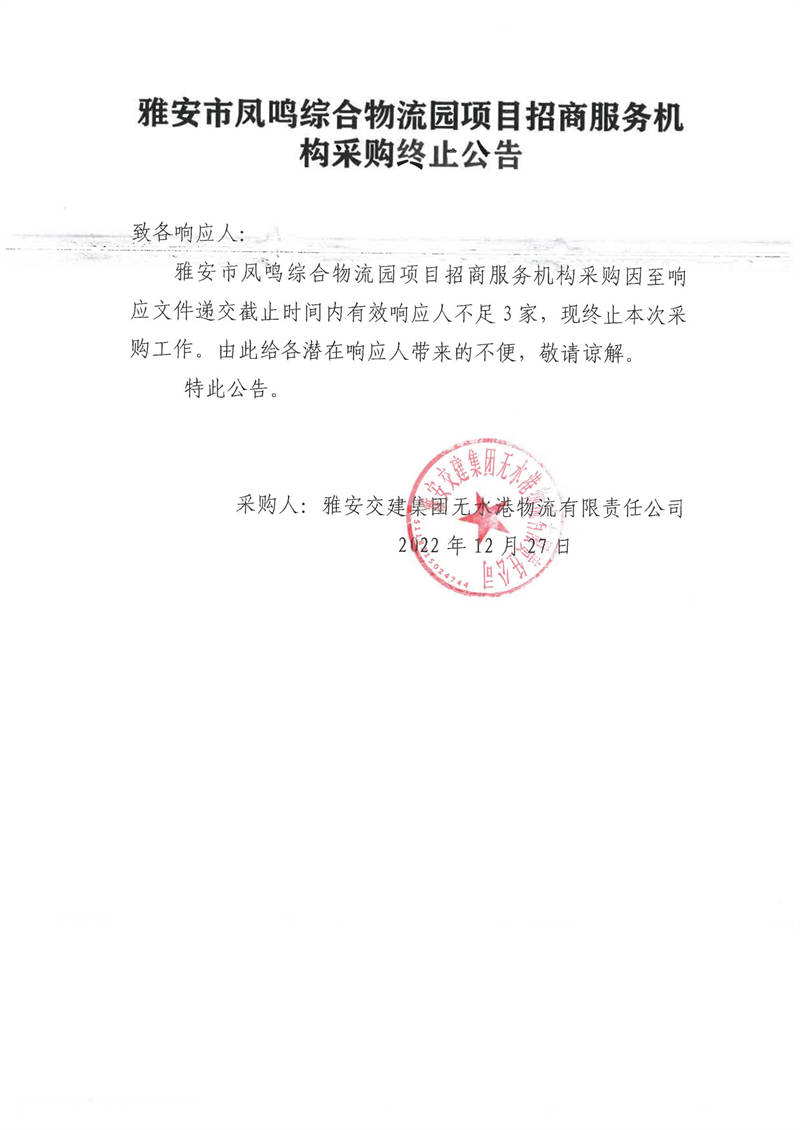 雅安交建集團無水港物流有限責任公司雅安市鳳鳴綜合物流園項目招商服務機構采購終止公告