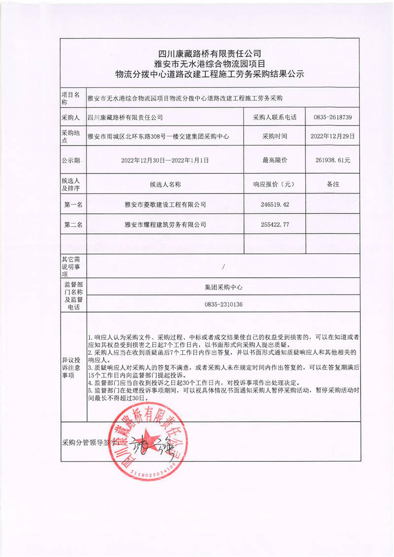 四川康藏路橋有限責任公司雅安市無水港綜合物流園項目物流分撥中心道路改建工程施工勞務采購結(jié)果公示