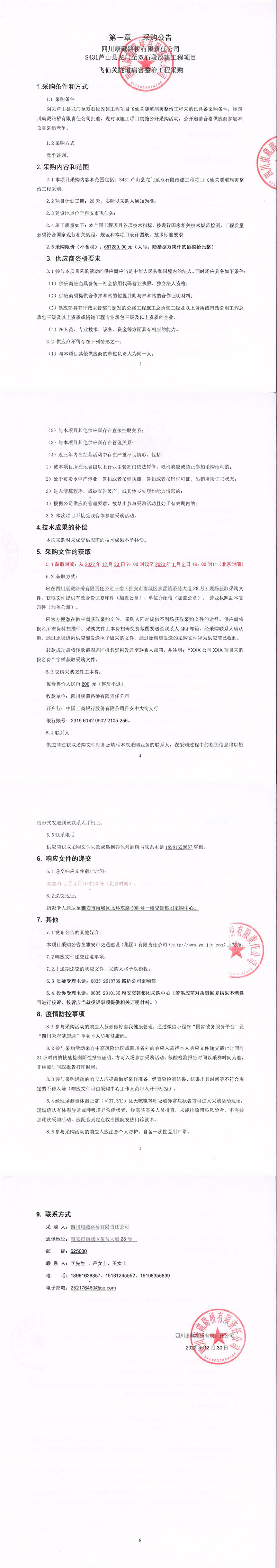四川康藏路橋有限責(zé)任公司S431蘆山縣龍門至雙石段改建工程項目飛仙關(guān)隧道病害整治工程采購采購公告