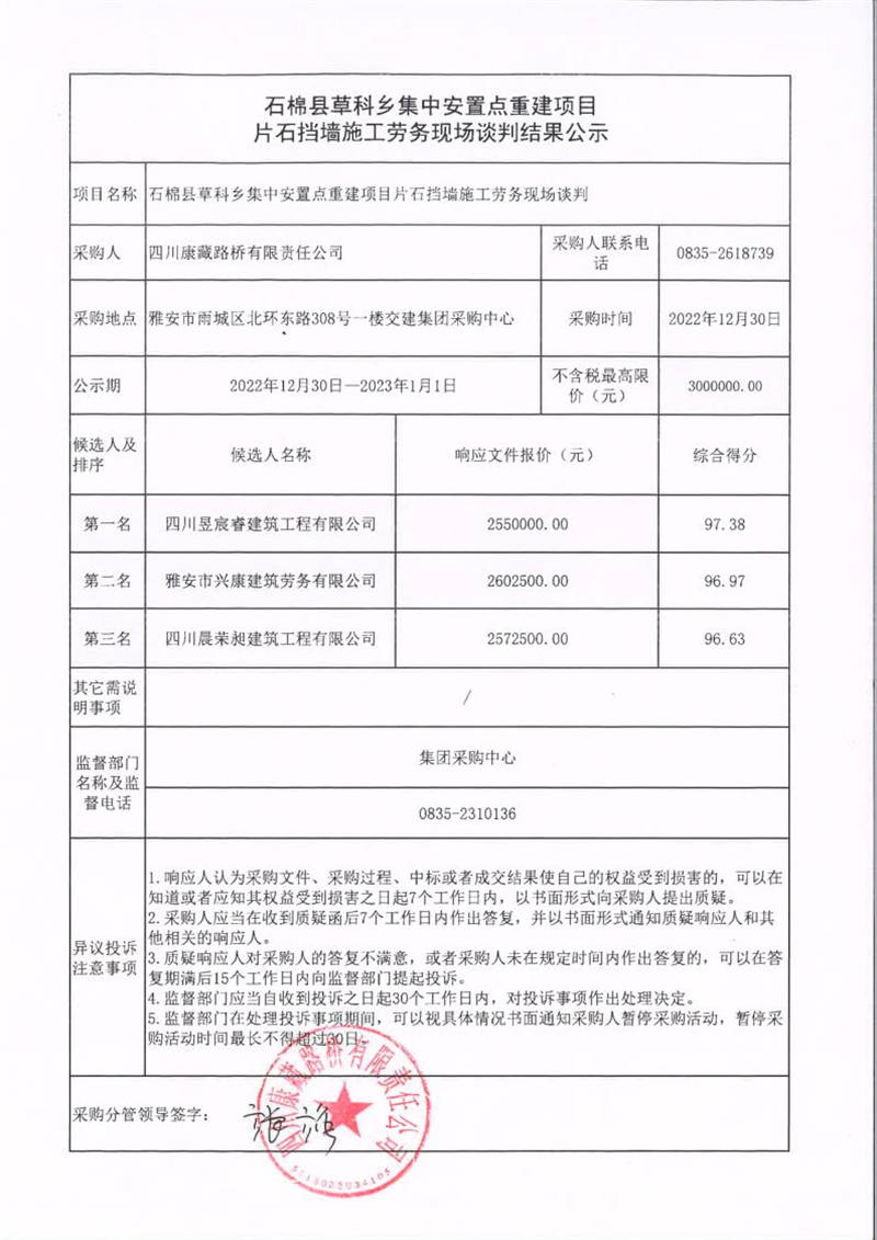 四川康藏路橋有限責(zé)任公司石棉縣草科鄉(xiāng)集中安置點(diǎn)重建項(xiàng)目片石擋墻施工勞務(wù)現(xiàn)場(chǎng)談判結(jié)果公示