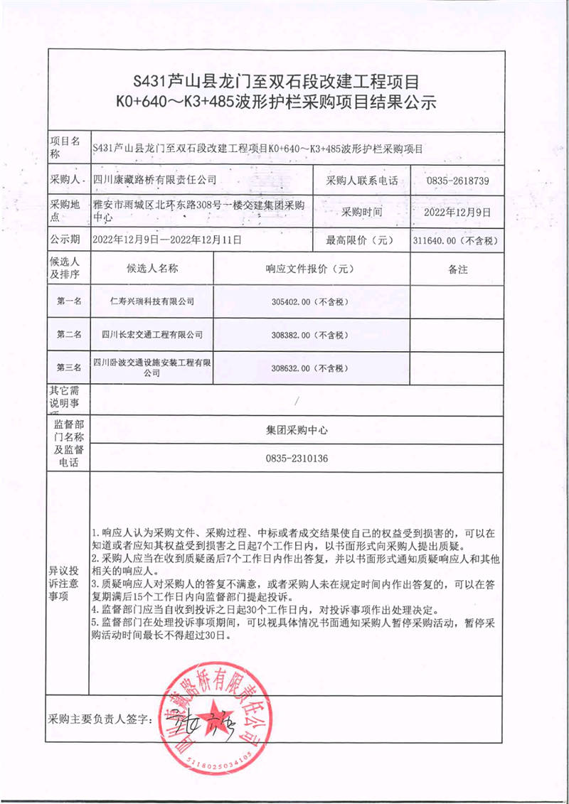 四川康藏路橋有限責(zé)任公司S431蘆山縣龍門至雙石段改建工程項(xiàng)目K0+640~K3+485波形護(hù)欄采購(gòu)項(xiàng)目結(jié)果公示
