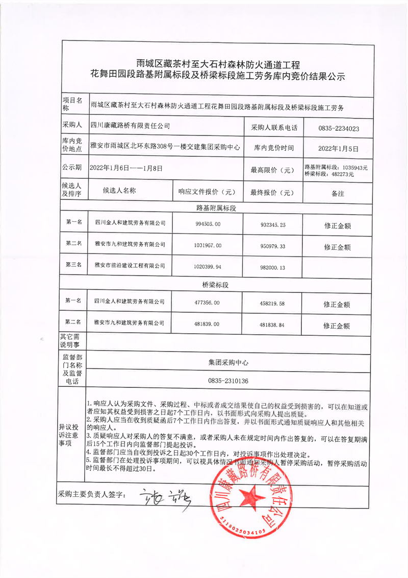 四川康藏路橋有限責(zé)任公司雨城雨城區(qū)藏茶村至大石村森林防火通道工程花舞田園段路基附屬標(biāo)段及橋梁標(biāo)段施工勞務(wù)庫(kù)內(nèi)競(jìng)價(jià)結(jié)果公示