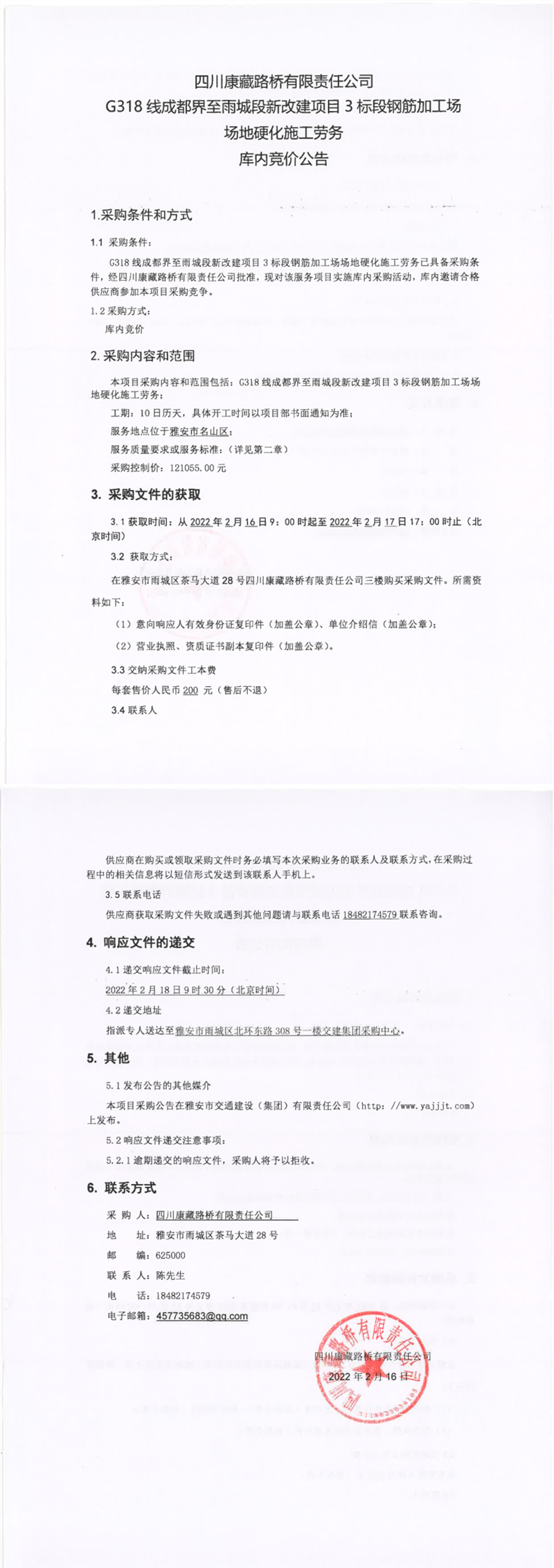 四川康藏路橋有限責(zé)任公司G318線(xiàn)成都界至雨城段新改建項(xiàng)目3標(biāo)段鋼筋加工場(chǎng)場(chǎng)地硬化施工勞務(wù)庫(kù)內(nèi)競(jìng)價(jià)公告